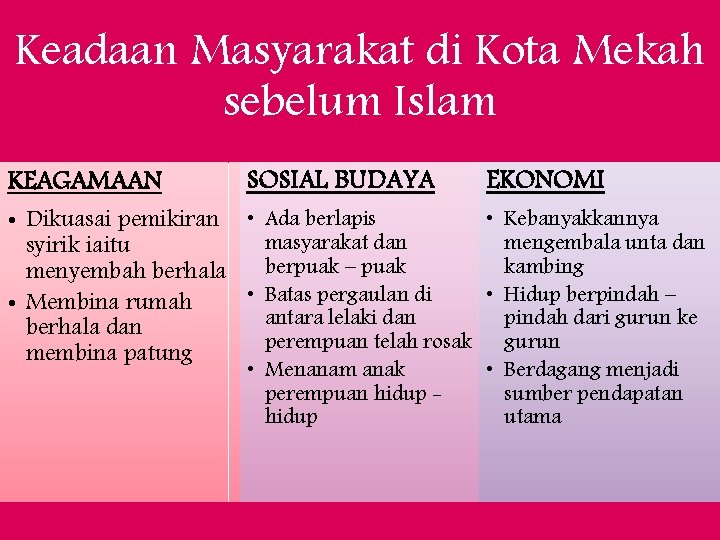 Memaparkan kondisi masayarakat mekah sebelum islam kompetensi dasar (kd) di. Kondisi kehidupan orang arab di jazirah arab sangat keras dan inilah yang memberi mereka kekuatan dan kesabaran untuk menanggung berbagai . Menjelaskan keadaan bangsa arab sebelum. Kondisi masyarakat mekkah sebelum islam (ski kelas 7). Keadaan masyarakat arab khususnya mekah pada masa sebelum kelahiran nabi muhammad saw.